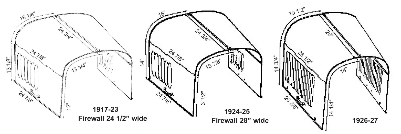 John, I don't know the reason of the change from rectangular to round lacing holes. I don't know that anyone alive, today, does with authority, but I have had 23-25 steel shells with the rectangular and 26-27 steel and brass shells with the round holes, but no rectangular in 26-27, which verifies what Steve said. Also, Thank you, Frank, for posting the dimension diagrams of the different hoods. As they show there was only 1/8" difference on the top hood panel on each side (total for both sides of 1/4") compared to a 26-27 hood and they show a 1 1/2" difference (per side; total of 3" difference) in the hood width at the firewall, it is obvious that the shell sides on 26-27 shells must have a greater flare than the sides of a 23-25 shell. I do not currently have a 23-25 shell to observe, but my previous observation is that compared to a 26-27 shell, the sides on a 23-25 shell have no OR ALMOST no flare to them. If they have any flare, it is minuscule compaired to 26-27 shells.John kuehn wrote: ↑Sat Jul 06, 2024 3:08 pmMaybe a different company making them or a design change for what reason??