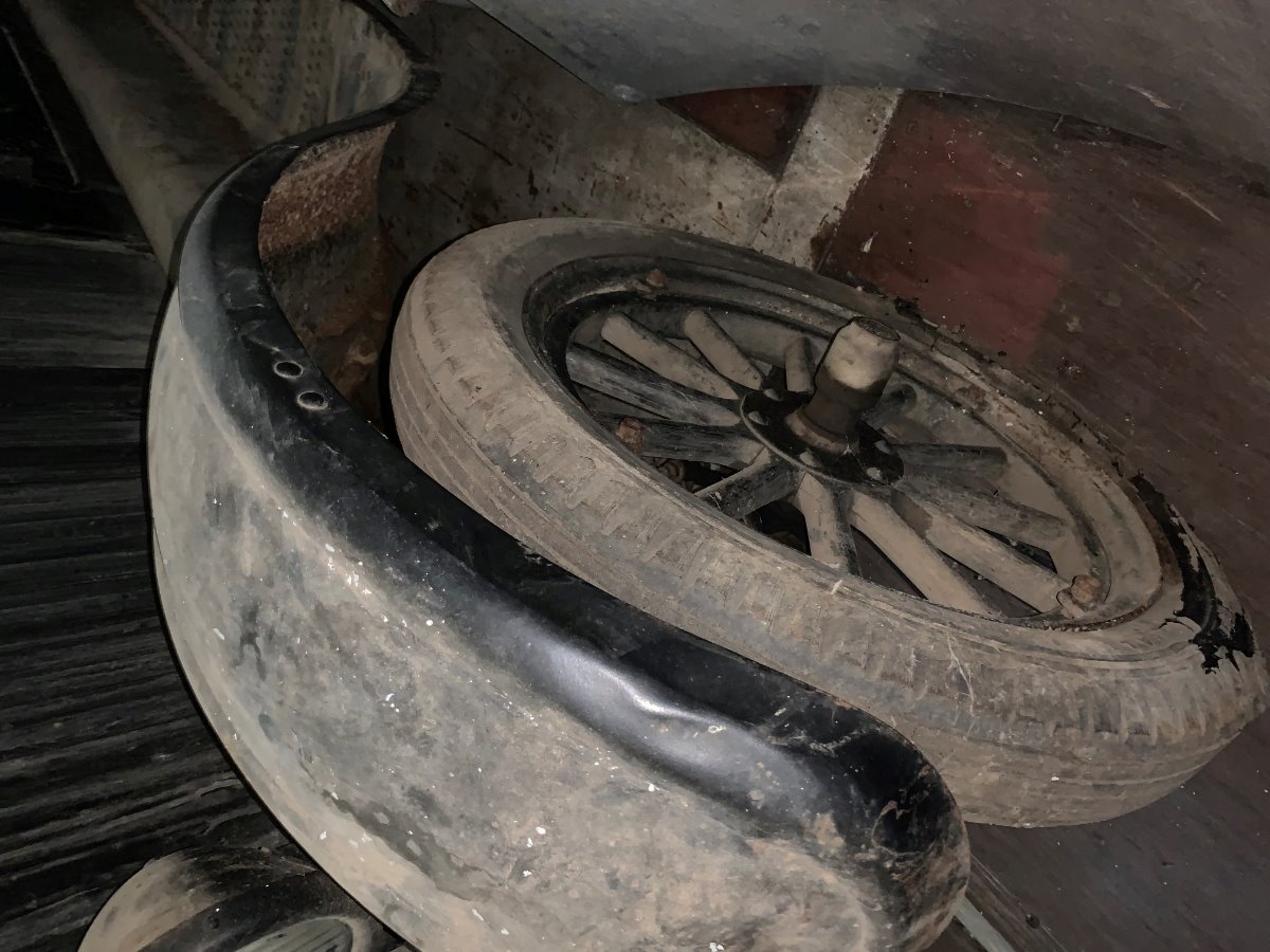 Update: The little pick up is rolling again on good rubber!! Thanks to Robert Weitzel and Erik Barrett. Not running yet, but cranks over and has compression!! The rear end is toast. The front axle is in backwards and shot, the spindles are flopping around. It is now loaded into FJ's trailer. I am not yet sure when it will arrive here?