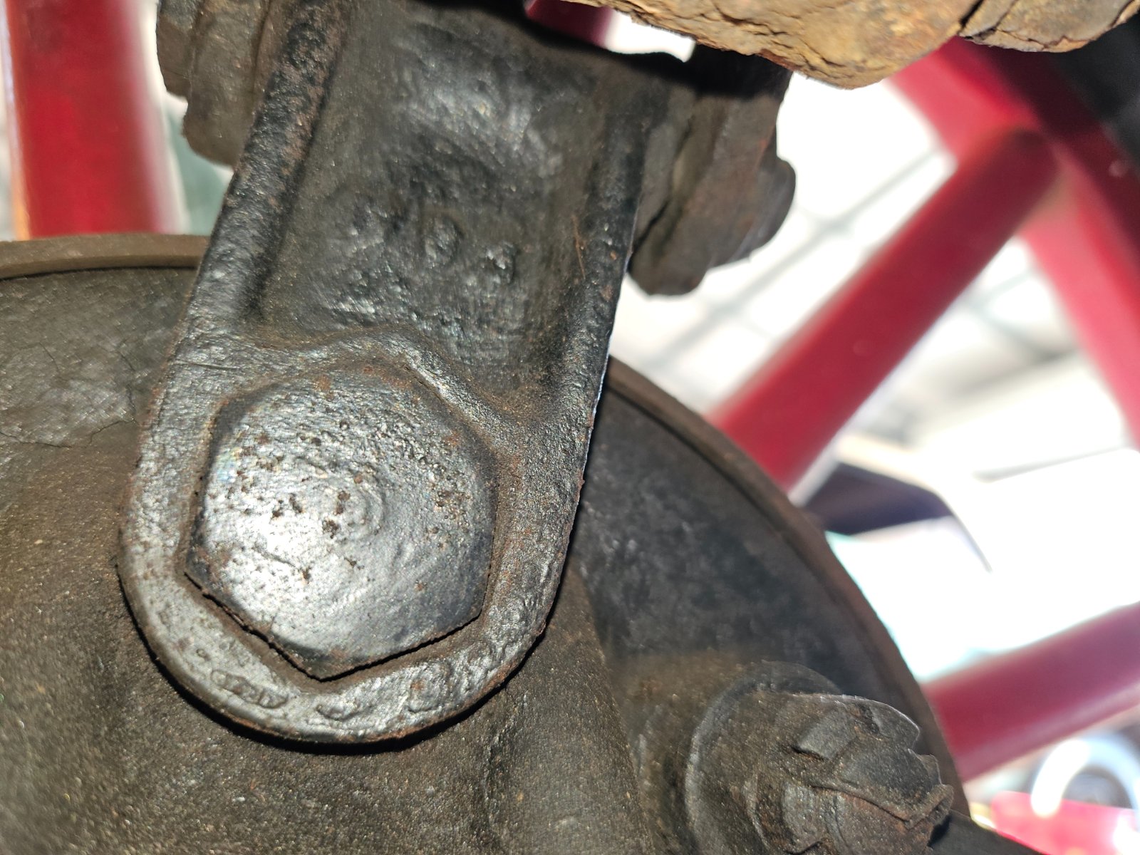 I haven't touched the rear axle yet, but removing/rebuilding the rear shocks will require getting some stock rear perches...the shock system replaced the rear perches, while using/reversing the fronts. In the pic you can see the flat perch style. This part also has some cast markings, only part of the shocks with any kind of marking... still can't make them out though. But, while not yet investigated, one side is disconcerting, reviewing the pics I take of everything, I don't know yet if it's a scratch, casting indent, or a really bad crack seen left of the bolt head.