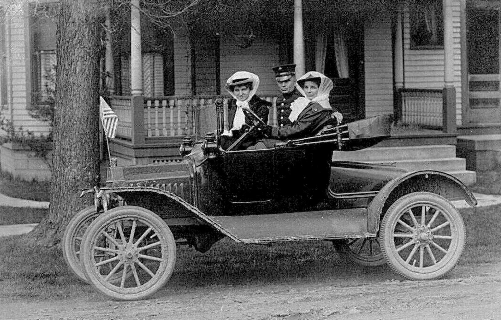 Number ten. A 1917 mid model year based upon radiator and fenders with the even folding windshield. Whiteish sidewalls on tires can be seen. Front tires appear to be smooth, no tread. Rears I can't be sure about the tread or not.