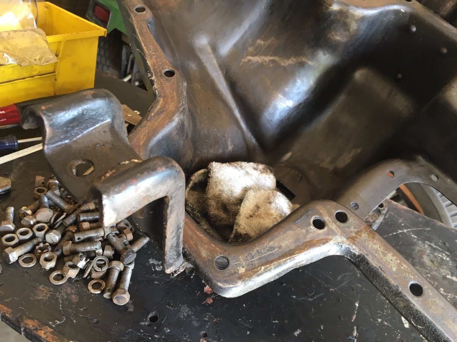 I kept the ball rolling today by cleaning up the oil pan and inspection cover and degreasing all the hardware for the oil pan and hogshead. I also have a new bushing for the crank handle. I wanted to get that installed today but the old bushing is really being stubborn about coming out. I think I'm going to have to collapse it in place and pull out the remains.
