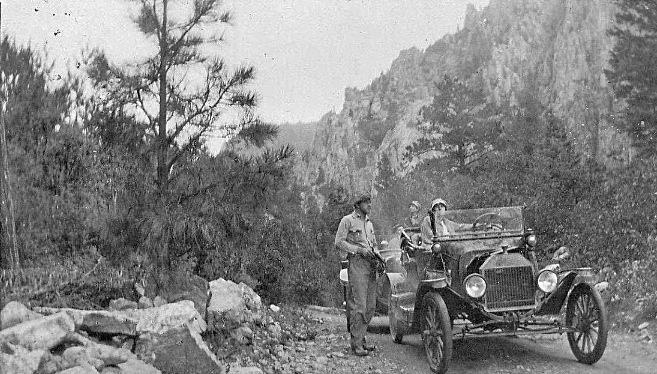 While I like the modern access? The digitization of era photos has lost a lot of clarity and detail in the original photos. I often zoom way in and see the pixelization effects. There just isn't enough detail left to know what he his holding. I certainly looks like a pistol. But it could also be a hat. Both he and the lady appear to be looking up into the hills in opposite directions. Could be looking for dangerous wildlife.
