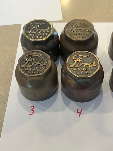 Brass hubcaps, 1914-16. Take your pick, no cracks, all are in good to better condition. $20 each plus shipping. Kdmks AT att.net.