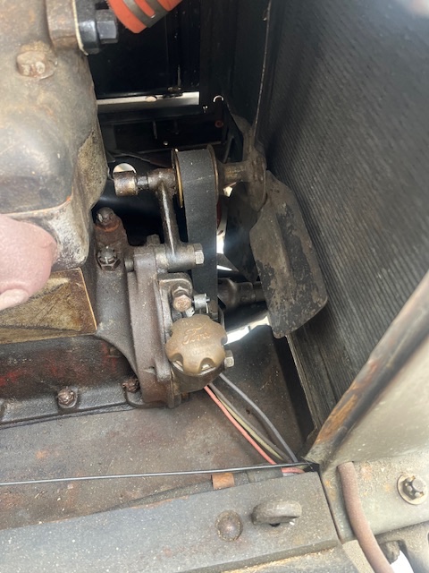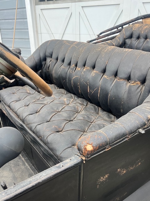 Original unrestored car, original top and upholstery, and paint. The fenders have been repainted. Safety glass in windshield and four new tires and tubes. Car runs, but haven't driven in for several years. There is no wear anywhere. It has a Stewart 100 speedometer, but is not connected. The starting crank and handle have no wear, and is a late 1913 build date. Engine number 378658, cast 10-13-13. Has 1913 hubcaps all around. The wheels have been scraped to the wood. $17,000.