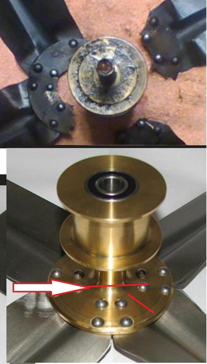 I am have trouble relating to the failed fan assembly. A side profile of the brass potion will help as well as the plate with the attacked blades. It looks like it failed at the neck where the plate has the riveted blades. But it also could have been a crack on the plat between two blades that caused all the damage when things came apart. But the material left inner rivets towards the neck doesn't match up to whats left on the pulley, why?