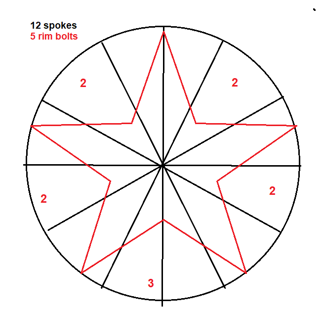Frank, I can't see a sixth bolt at your arrow. nor can I see a lug. If there is one, the spoke interval would really be interesting around it. Your star pattern for 5 bolts would work, if the apex was rotated a bit left or right so that it does not interfere with a spoke tenon at that point.