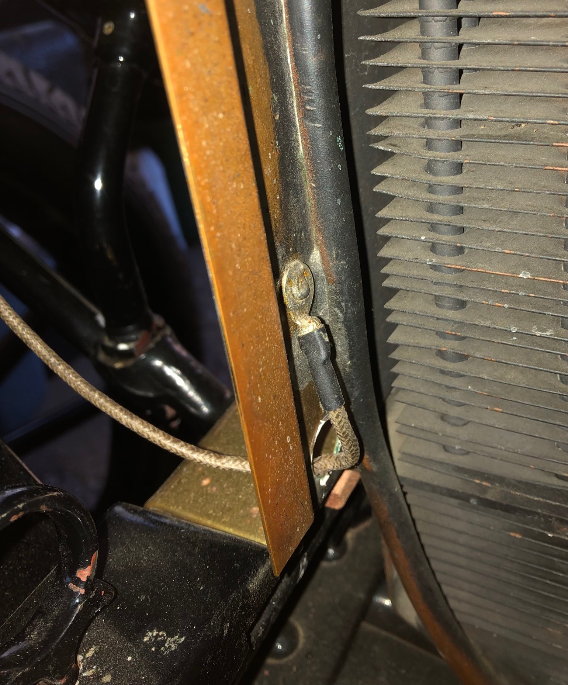 My 1915 Touring headlight ground wire. Note: cross tube and wire not shown. Needs to be repaired. I don’t know this to be original. For your reference.