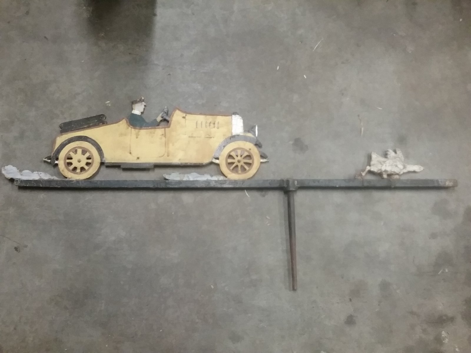 After 50+ years of storage, a little more house keeping, I finally decided to sell the old metal weather vane. Absolute great piece of original folk art, with the sport roadster scaring the chicken off the road. Overall size 39" long X 16" tall. Completely original condition. $500.00