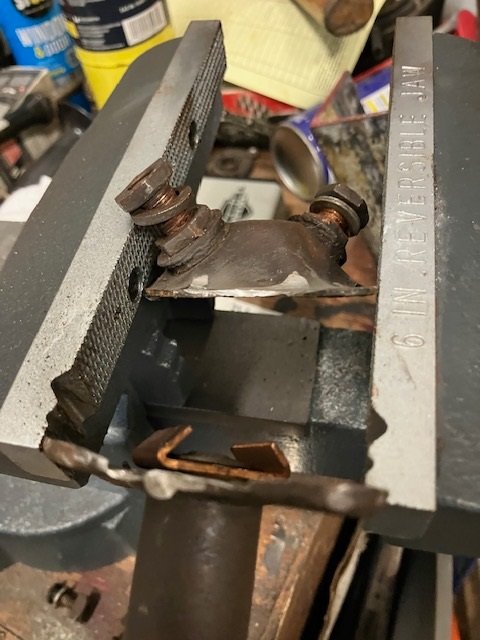 I have the shorted stud off of the switch. After taking the nuts off I tried to turn what I think is a threaded washer off but that didn't seem to work so I put a nut on the end and hammered it and it came off with problems. I think that this washer is threaded to the stud and I bent it out of shape a bit by hammering it off. In picture one the metal washer circled in red in picture 3. You can see the gouging in picture one. I turned it the last few turns off the end of the stud and that was worse shredding the threads. When I got it off I found it has a triangular hole in the washer so I think it was kind of threaded. I hesitate to put this back on because I think it will tear it up again. I had to get my tap and die set and re-cut the 3/8 inch 16 pitch threads. Whatever the original grey insulating material is on the inside it is sheared off and probably no good anymore. It is pictured in picture 3 the topmost grey square material. From picture one that stack was from top down a threaded washer and two insulating washers. The stud had two nuts and a split washer to hold the cable on. I also managed to lose somewhere Lang's starter switch non-conducting gasket/washer set 5014GS that arrived in the mail. I don't know how to proceed from here to re-pack that stud back on. I think that threaded washer is damaged and I don't think the stud would take another tearing up again. I also don't have any non-conducting 3/8 washers since I lost the 5014GS packet. I would need 3 non-conducting 3/8 inch fibre washers and a way to hold it down. Maybe a 3/8 16 pitch jam nut? Amazon has 3/8 non-conducting fibre washer but they want to sell me 30 of them, same with the jam nut they want to sell me 25 of them. Maybe it will work to hammer the threaded washer flat again and try my chances.
