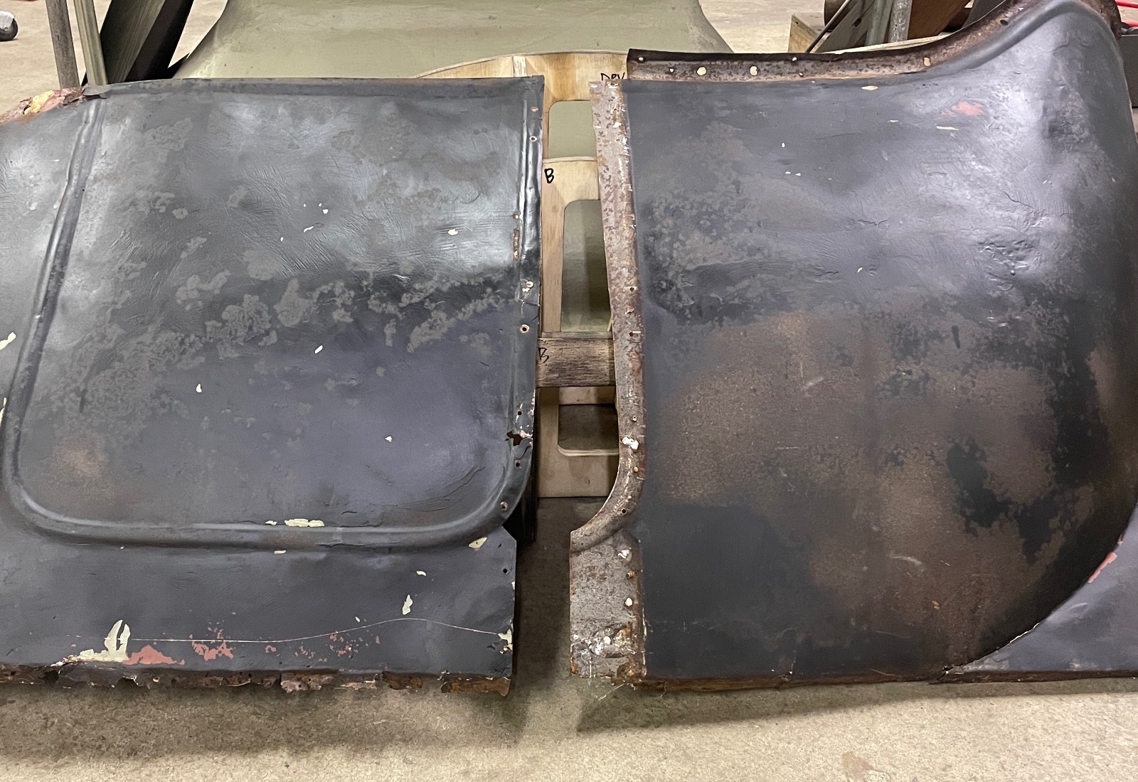 Looks like both sides have had previous repairs. The driver side fake door panel looks to be replaced all the way to the top edge. The passenger side "rocker" panel area as well. Both sides have unfinished seams probably because of the difficulty of welding the seam in those areas due to the sheet metal is laying directly on top of the sill wood. Pretty sure those open seam areas on both sides should be smooth.