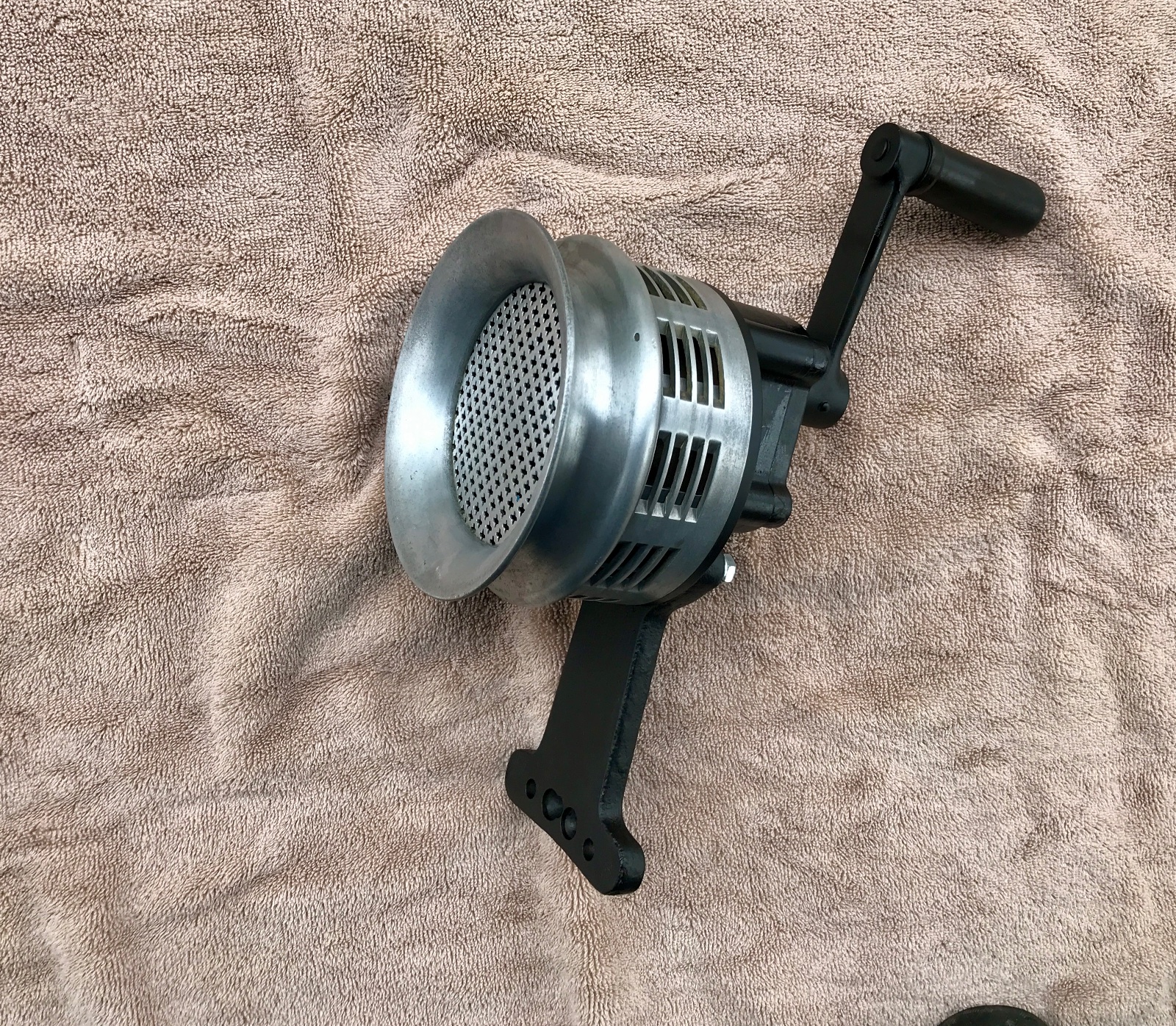 I am unsure of this particular manufacturer, however it definitely was not made in China. It is very well made, with precision, and is similar internally to the Sterling Sirens of the era. I have owned and restored many sirens over the years, and I restored this early Sterling that was sold to a collector last year. This siren is more robust and better made than the Sterling in some ways. There were many manufacturers of hand crank sirens back in the day, many copying each other’s designs in some respect. When sirens turned electric, the hand cranked ones were often junked or thrown away. Well made sirens were not toys, they were designed for heavy abuse and use, military and civilian.