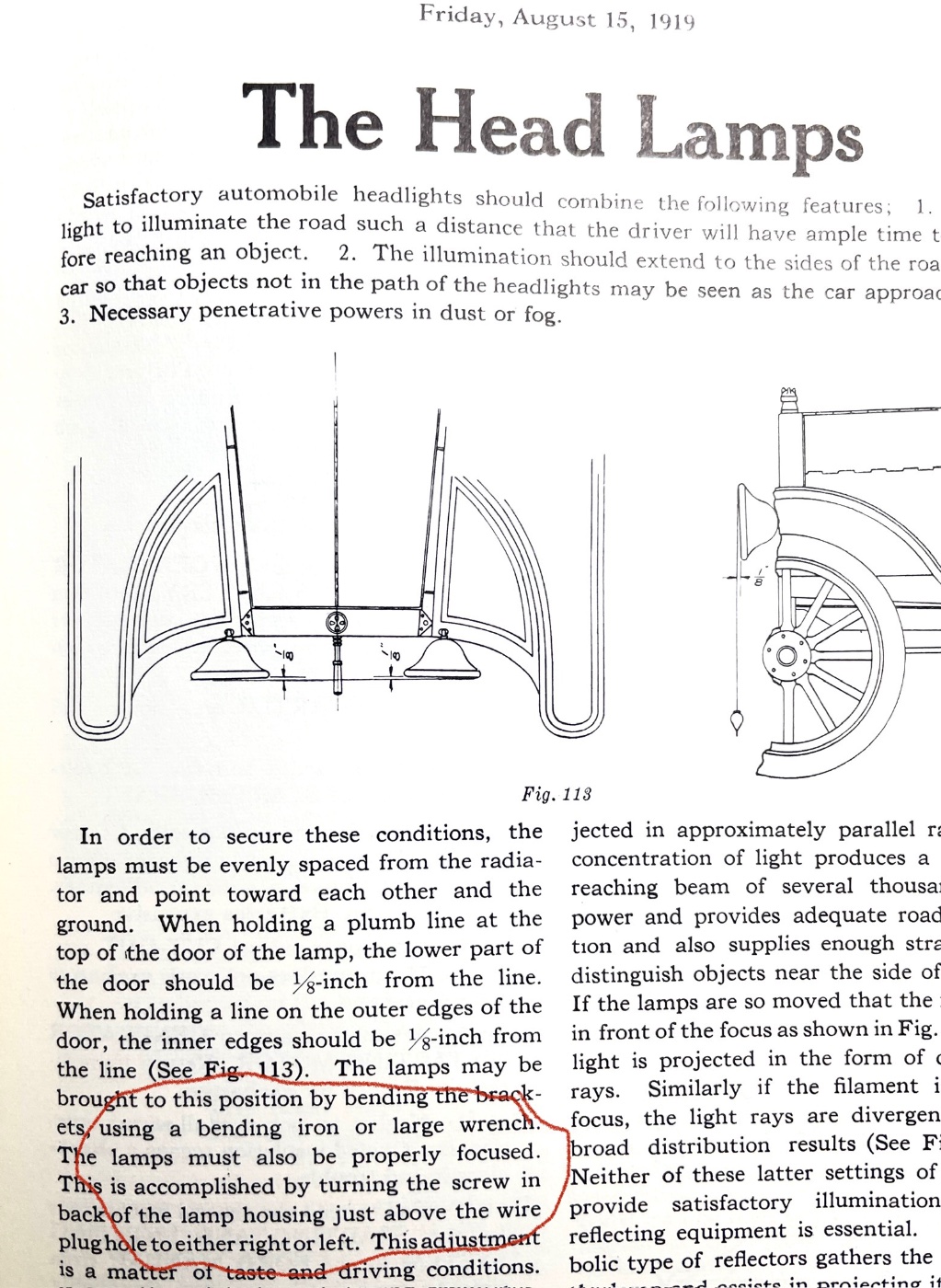 Dan has all the best info, and the period documents to back it up!George House wrote: ↑Thu Jan 16, 2025 2:36 pmGood advice all ! I shall follow it. Thanks especially to Dan Treace for the 1/8” plumb line info when a string is placed at the upper headlight rim and the 1/8” distance that string should be from the lower headlight rim. ..