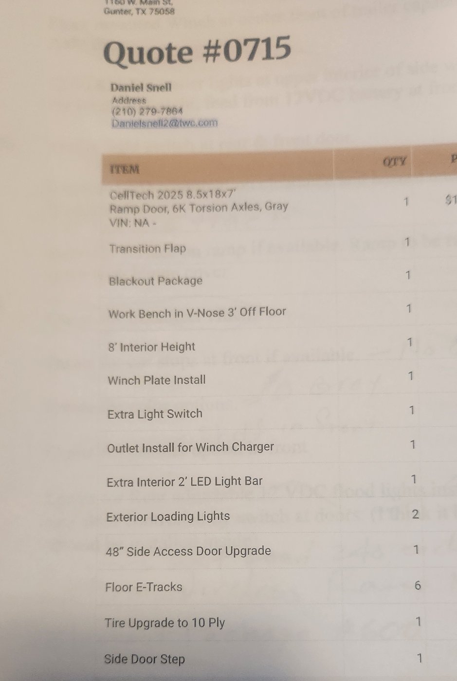 Ok guys, I wanted to let those that responded to this post, and anyone else interested about Enclosed Trailer Options of my decision thanks to the tons of advice you provided together with my personal research into Trailer options. I ended up purchasing a Celltech Trailer built to the attached specs in Waco, Texas. It was a bit expensive but very well built and should hold its value. It does not use wood of any kind. The walls are all molded, check out their website to know more about the construction. Size I chose was 18 foot by 8.5 foot by 8 foot interior height. The e-tracs on the floor are 58 inches apart to accommodate the tire tracks.