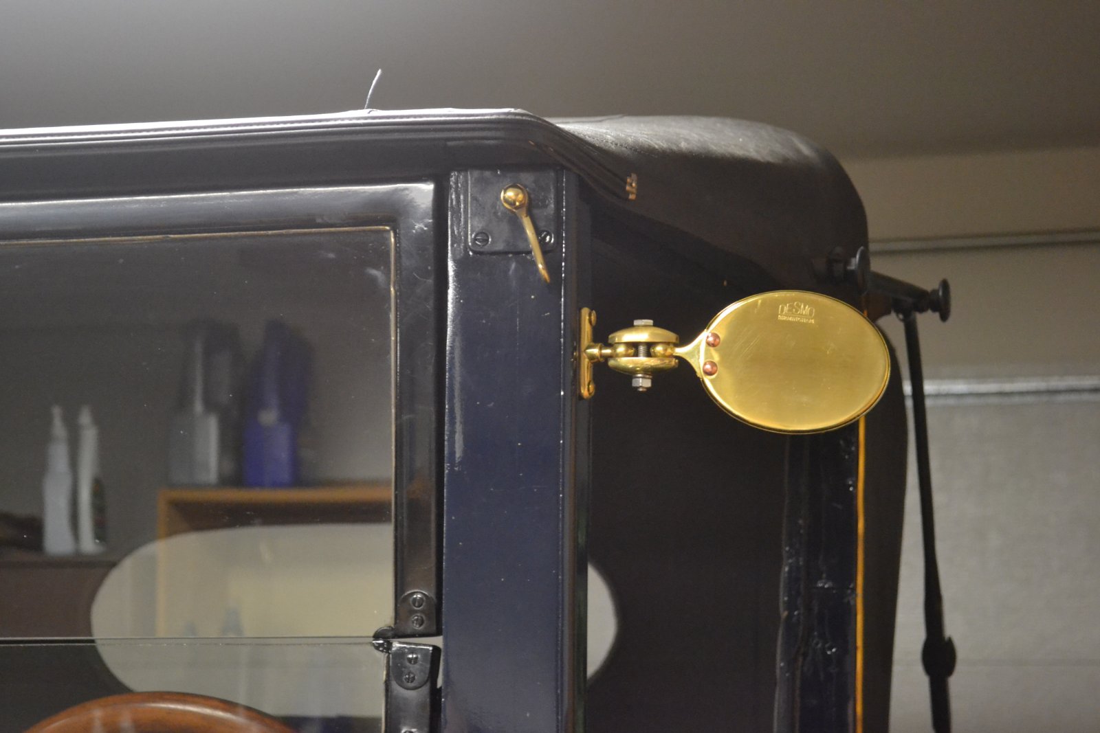 The mirrors I put on my coupelet came from England, from a company called Vintage and Classic Spares. Google them, go to their website and scroll down to exterior mirrors and search for Desmo 263. It is a very heavy, well made mirror that mounts on the front posts. It is available in left or right hand. I got both, along with an interior mirror mounted on the windshield header. It is in interior mirrors, B-17690. I painted the metal parts black and it looks like it belongs. A picture of one outside mirror on my car.