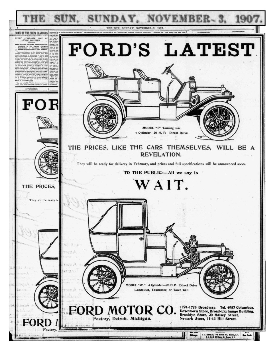 Ford Motor Company began describing their projected 1908 lineup in late 1907. Sales ledgers indicate at least 3 Model T were sold in late 1907 and early 1908. This advertisement appeared in the New York Sun newspaper in November 1907.