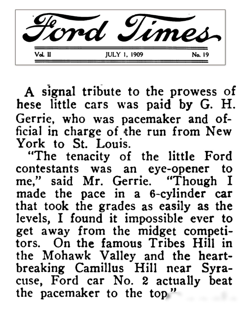 Your comment reminded me of a couple of paragraphs that appeared in the July 1, 1909 Ford Times regarding the Ford 6-40 and the "midget competitors" during the run: