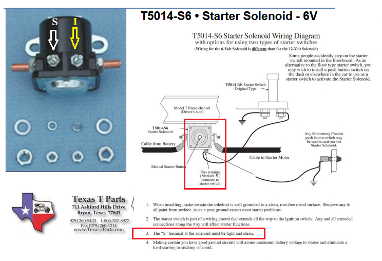 I don't like the location of the original starter button, so I am wiring a solenoid in my wife's 6v speedster (negative ground) and have found two vastly different wiring diagrams:
