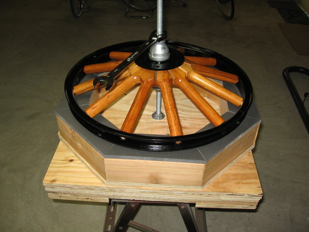 I am fortunate enough to have a good friend with a large hydraulic press with incremental foot control for the ram travel. Even with our Canadian spokes with the double taper, they can be a problem. With his press there is no chance of cocking the load on the spokes like the photo shows using the Reagan press. I set up the wheel in the press with the hub flange and the wheel felloe supported. The spokes are pressed down with a generator body as the driver. The press allows a decent drive to push the spokes home. The last one I did had shims on the tenon end, so it was extra tight. It was perfect straight off the press. Just had to bolt the outside plate on when finished.