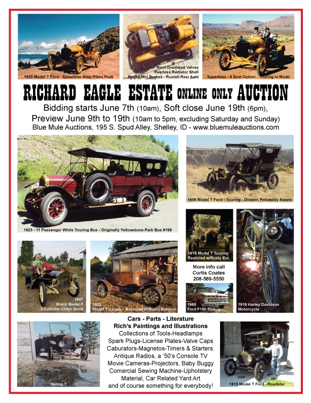 Online/Live Auction at Blue Mule Auctions, June 7, 2024 – Featuring – 1923 Yellowstone Park Bus, 1907 Buick, 1919 Harley Davidson, 1920 Model T Speedster, many Model T’s, and other cars, parts, literature, and Richard’s paintings. Online Pre-bidding starts on May 24 at www.bluemuleauctions.com."