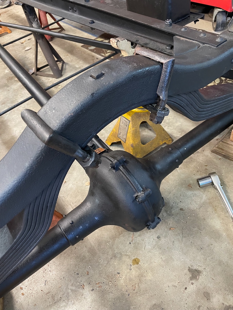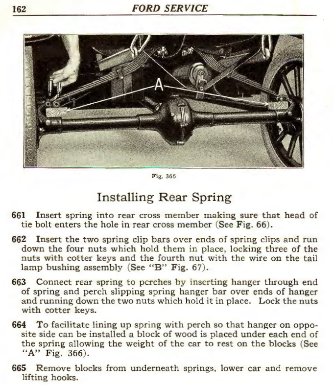 Works easiest with some weight on the chassis. Body on is easiest, even someone sitting in the back seat or in the turtle back some weight. Put wood block under one end and install the shackle. Then another block under the other end of the spring to install the shackle. When you get the shackles in and tight, then take the wood out and let the spring find it's own position. Hardest to install without any weight on the rear spring.
