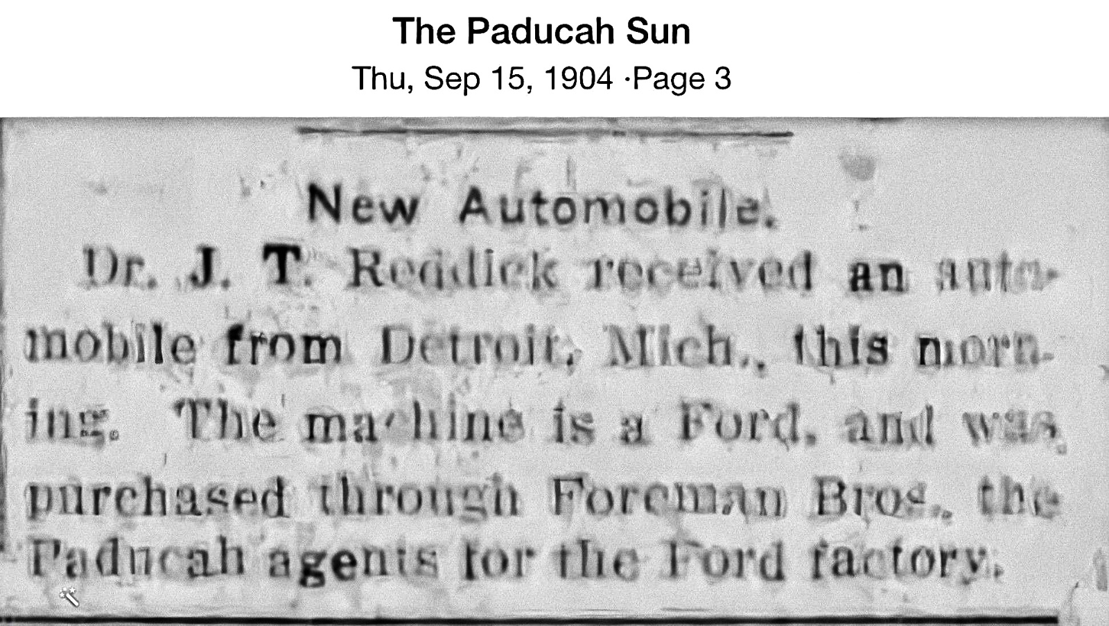 Next, the local newspaper confirms the Ford Model A arrived by September 15, 1904. The railroad moved the Ford Model A from Detroit to Paducah Kentucky in two weeks.