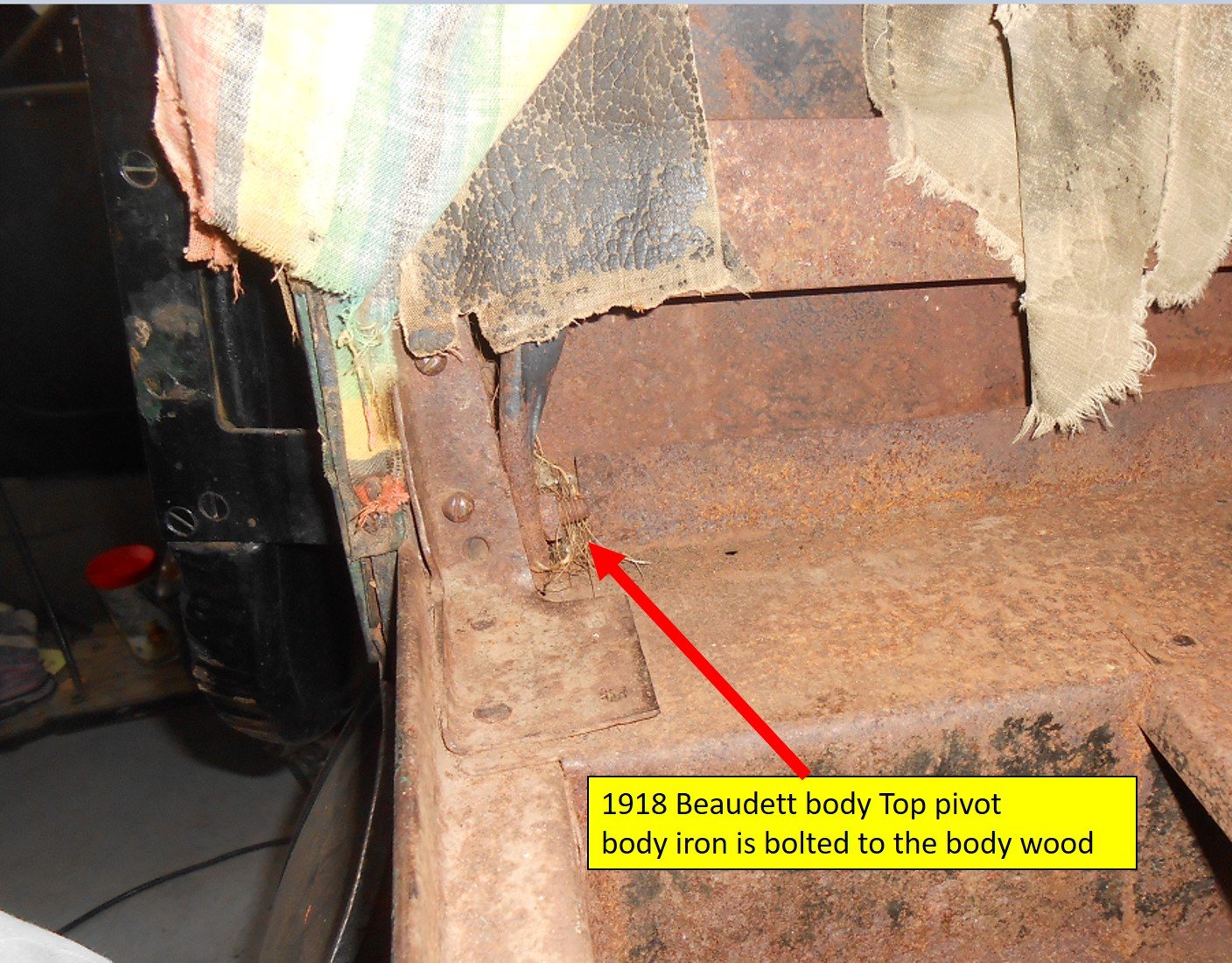 Below is a photo of the right rear seat top pivot iron from our unrestored apparently mostly original 1918 Beaudett bodied touring. While the upholstery (what is left of the original is under the 1950s college seat covers) hides the long part, you can easily see were it attaches to the door frame wood just above the metal rear seat frame. So that style rear pivot body iron goes all the way from just over the side of the body to the just above the rear seat heel panel.