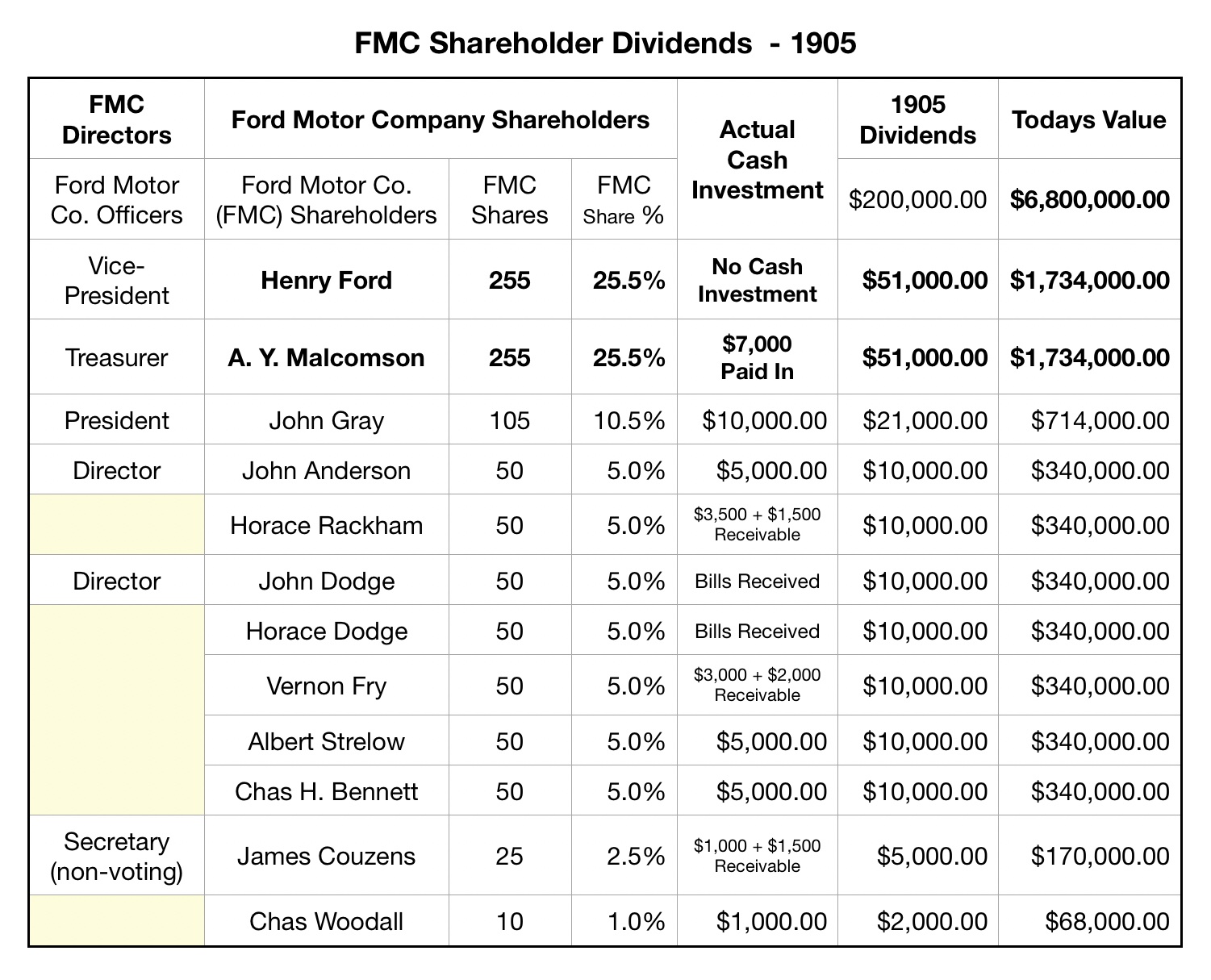 This spreadsheet shows the amount each shareholder initially invested with FMC, and the resulting 1905 dividends, and current value conversion:
