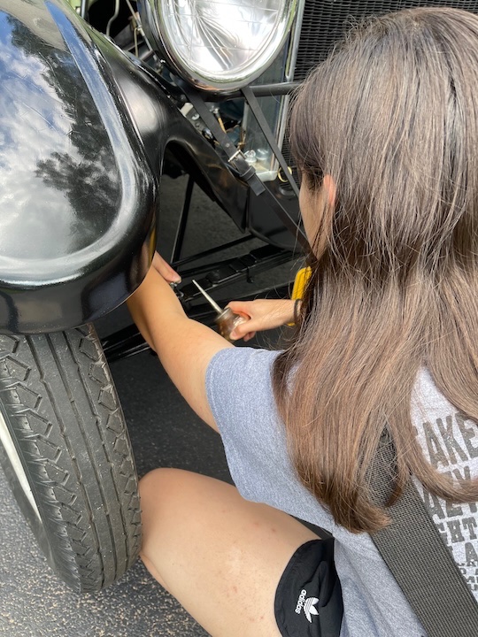 Then after taking the car out a few times I had to adjust the reverse band. This is the first adjustment I had to make. The reverse peddle went all the way to the floor and Didn't grab as well as I would like. I also found that the peddle was bent (normal for a 100 year old car) and was catching on the floor. So we cut the wood out a bit so it would clear. Someday we may bend the pedals back into shape. The floor isn't original so We didn't mind cutting it. Here are some shots and a video.