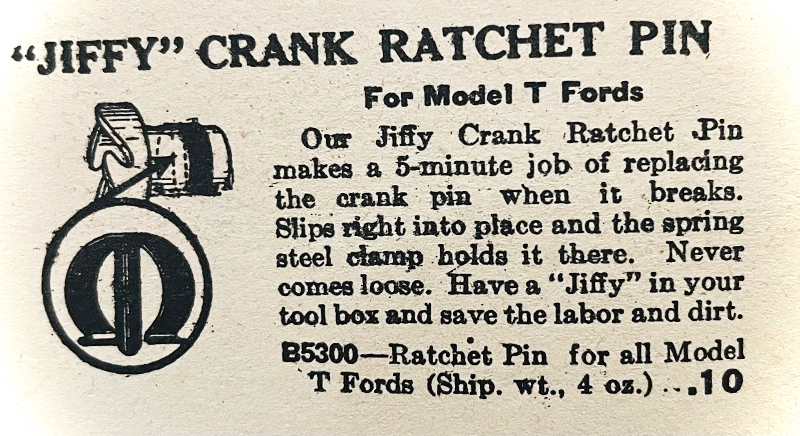 When the pressed steel crank ratchet was adopted in 1912, a new pin was designed and given the factory part number T-4491. This too is a straight steel pin 5/16-inch in diameter, but it is only 1-3/16-inch long because the stamped steel ratchets were smaller in diameter at the pin hole than the forged ratchets were. These pins were also riveted over on both ends, again permanently attaching the ratchet to the starting crank. The adoption of the malleable iron design ratchet in 1914 made it necessary to change the length of the pin again, this time increasing it to 1-1/4-inches long. Despite being longer, it was considered to be useable on both the pressed steel and malleable iron ratchets.