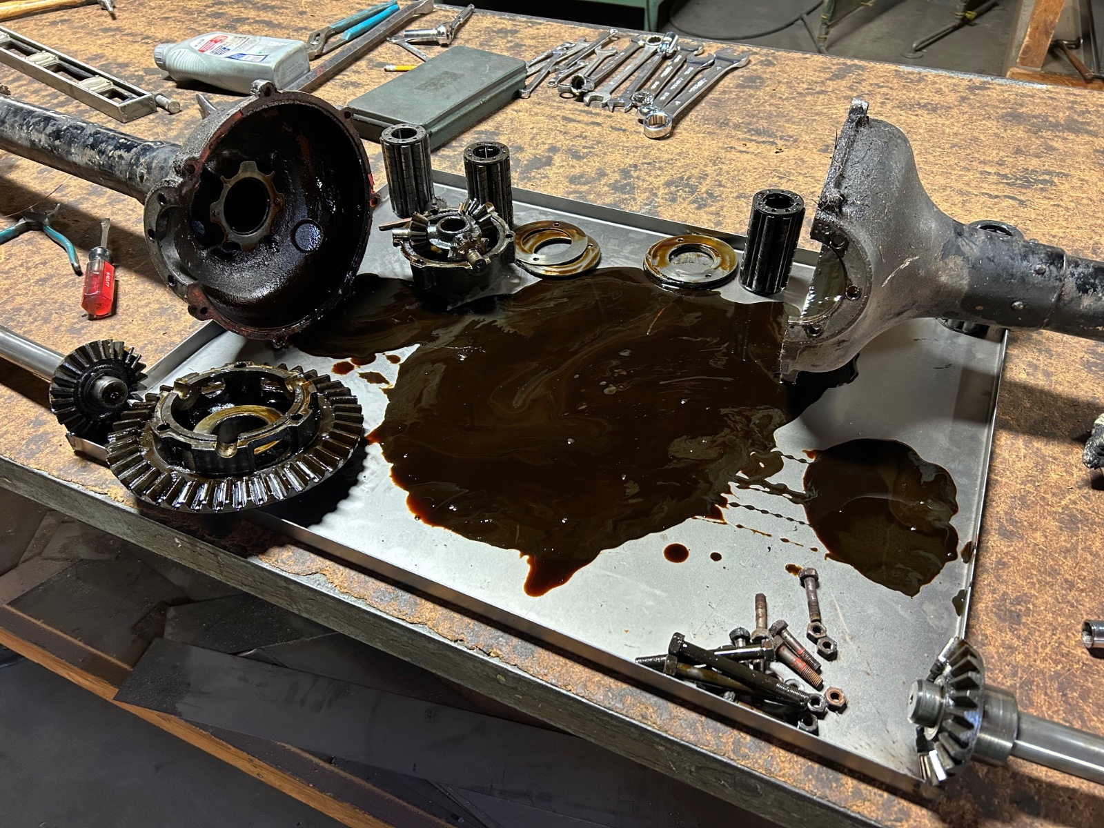 I have a pr. of housings, so I bought a donor rear end. Turns out the guts were very nice. Put tha axles in the lathe and arrow straight. Ring and pinion very nice also. Axles are centered, so no bent housings. The usual thrust washers and pins were replaced. I’m waiting for a driveshaft to set the pinion, but so far so good.