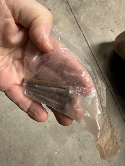 The only place I had not looked for the pins was in a box I knew was in the front V section of my enclosed trailer where the body had once been stored. The trailer has been loaded all summer with insulation for my polebarn preventing access. I guess it was time to empty the trailer anyway. TA DA!! I found them in a bag along with the door hinge pins right where I had left them. In case anyone wants to know the pins are 13/64 X 2" wIth a slightly domed head. Thanks for the responses. Art