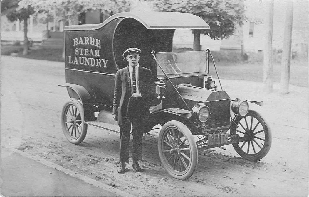 That is a lot of 1912 T Ford delivery trucks with decals just behind the doorway!