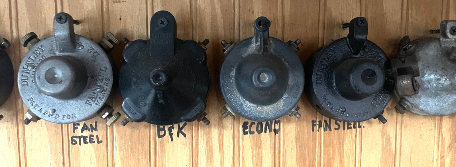 Have two marked "Duntley" and Fan Steel Makers" in my "Wall of Timers", the rollers are a dark material, but a bit swollen in shape becoming oblong round, and some won't spin again.