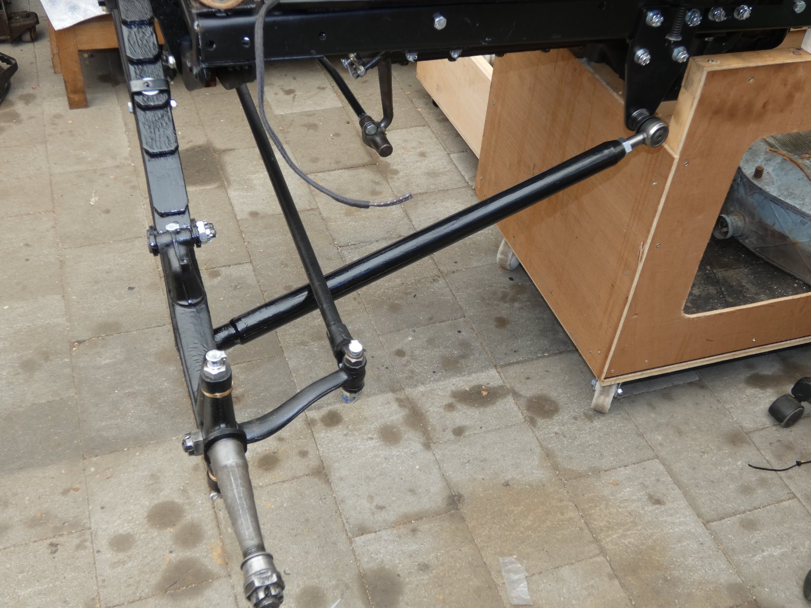 Note also the way the suspension was stablilized with two adjustable rods to the back. The original V- rod was to short because of the new place of the front axle.