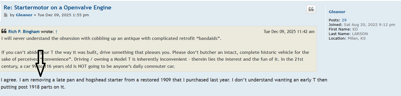 I agree. I am removing a late pan and hogshead starter from a restored 1909 that I purchased last year. I don’t understand wanting an early T then putting post 1918 parts on it.Rich P. Bingham wrote: ↑Tue Dec 09, 2025 11:42 amI will never understand the obsession with cobbling up an antique with complicated retrofit “bandaids”.