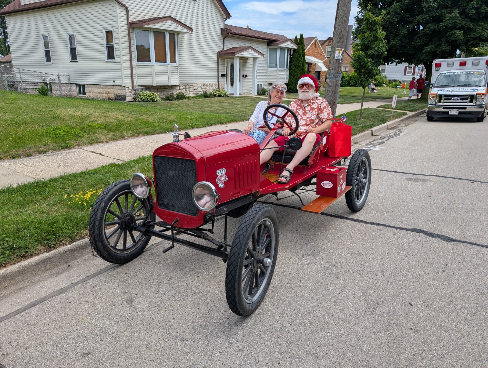 This was Christmas in July. The winter outfit would be a little warmer...........Remember, No windshield. No fenders. No problem.