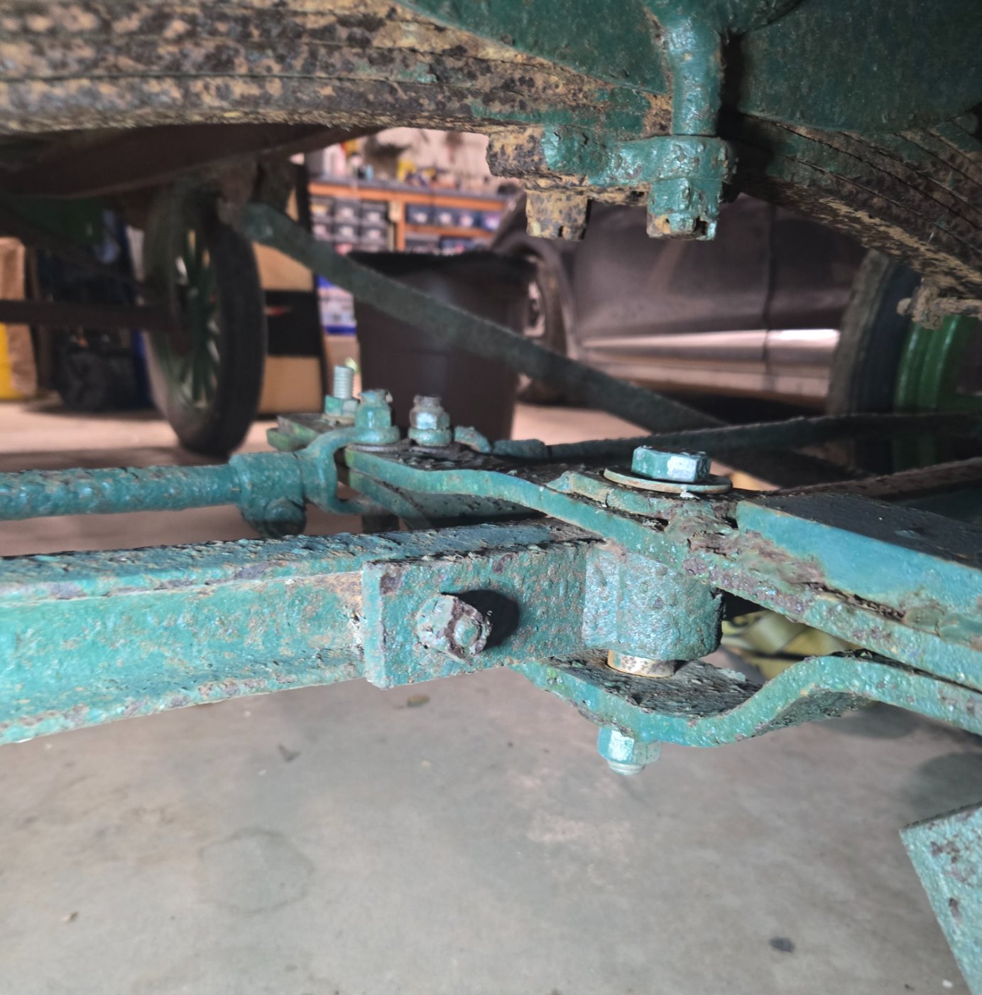The bushings in the perches are shot, so if I feel like tinkering this summer, I will tackle them...otherwise it's a testament to what can be built from a tired Model T. The front tires are new, and the rear are checked, but no strings showing. They should last for years as a chore wagon. Interestingly there is a taillight under it, but no wiring. Also, the hitch is pretty cool!