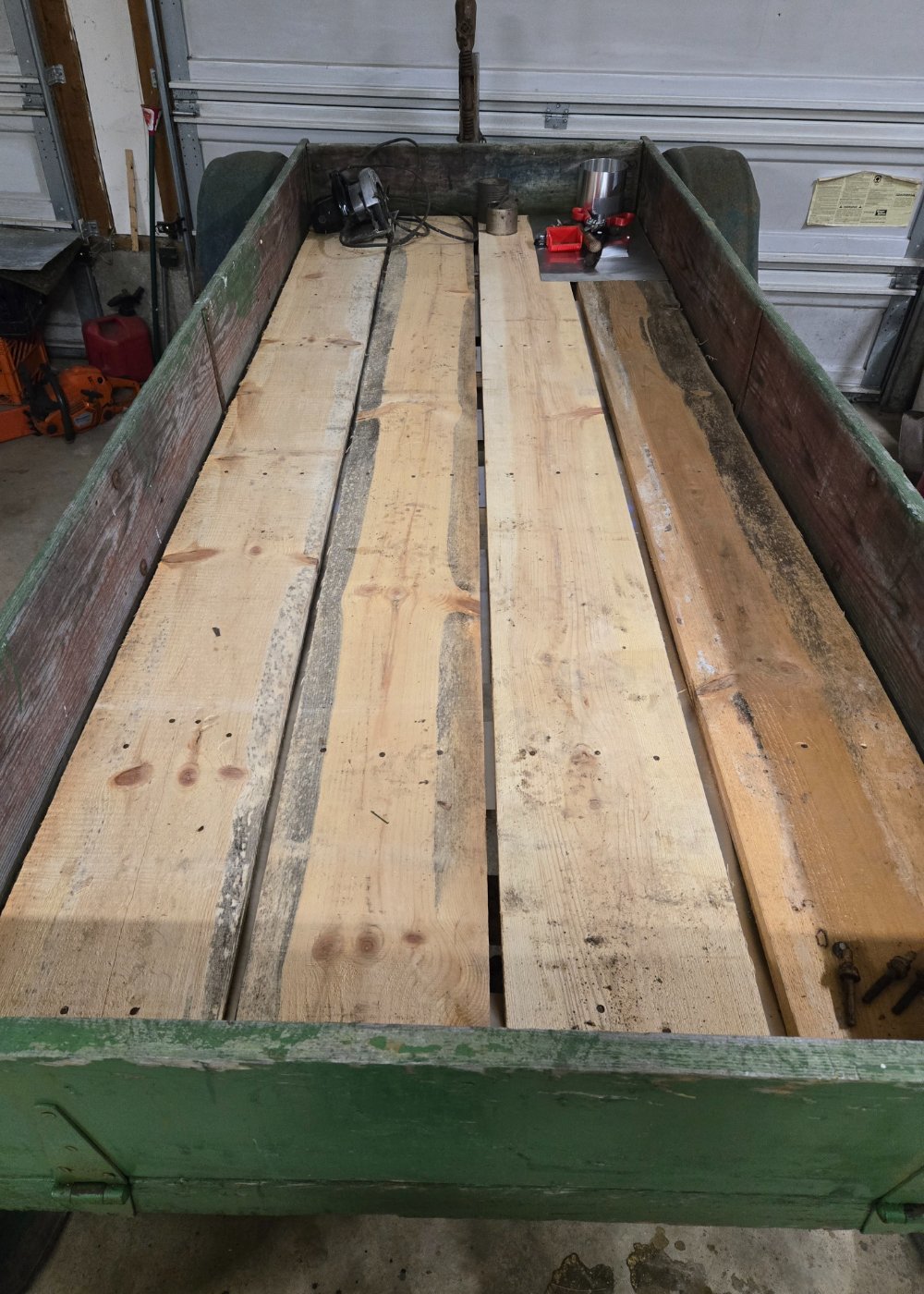 Just finished putting a new floor on the wagon. Unfortunately, it sat outside for sale for months and started growing mushrooms underneath. It's a shame that it lasted for decades under a roof just to rot in a yard. The rot on the ship lap floor was significant. I decided to try to preserve what I could and then structurally rebuild around the original bad wood. Then put flashing over the cross members. Since I will use it to collect maple sap, I left wide gaps for splashes to drain through.