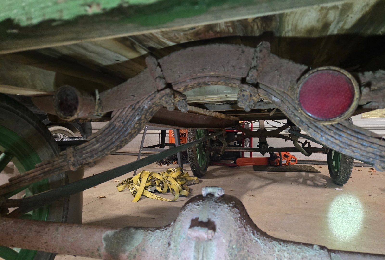 The bushings in the perches are shot, so if I feel like tinkering this summer, I will tackle them...otherwise it's a testament to what can be built from a tired Model T. The front tires are new, and the rear are checked, but no strings showing. They should last for years as a chore wagon. Interestingly there is a taillight under it, but no wiring. Also, the hitch is pretty cool!