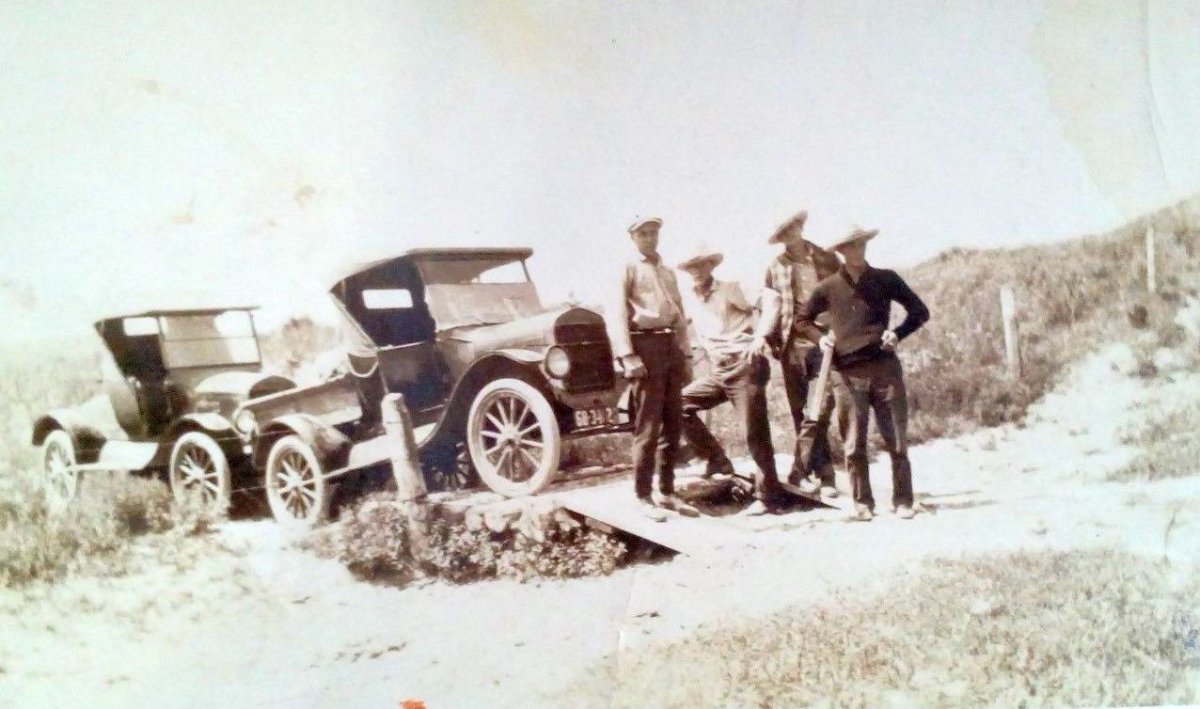 This last photo is a bit of a mystery to me. Is that a pet badger, teddy bear or dead gopher he is holding? It's staged to look like one of the youngsters is driving. I see a pair of feet under the far running board.