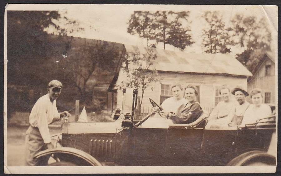 This last photo is a bit of a mystery to me. Is that a pet badger, teddy bear or dead gopher he is holding? It's staged to look like one of the youngsters is driving. I see a pair of feet under the far running board.