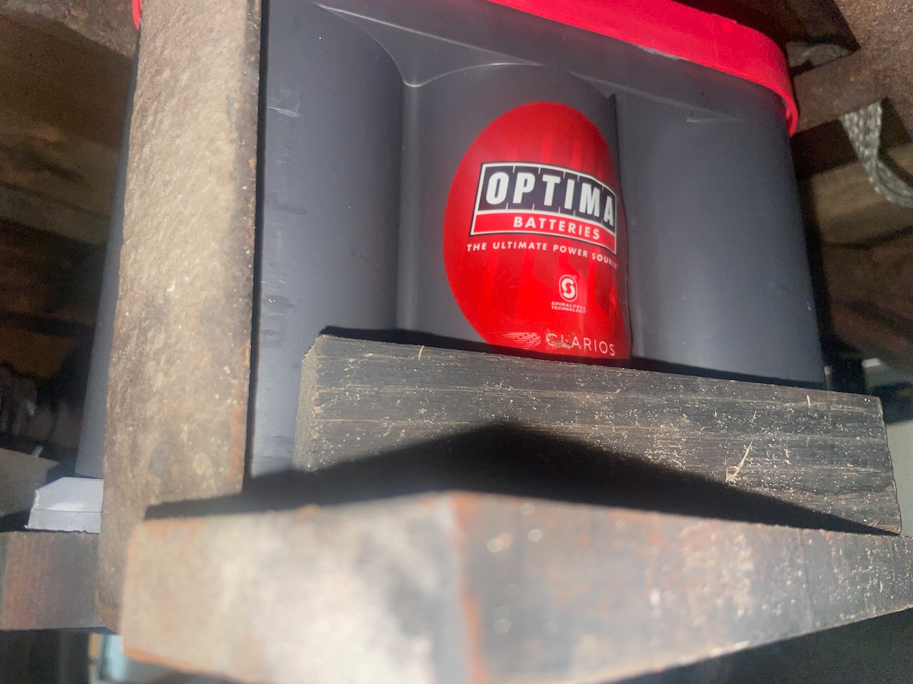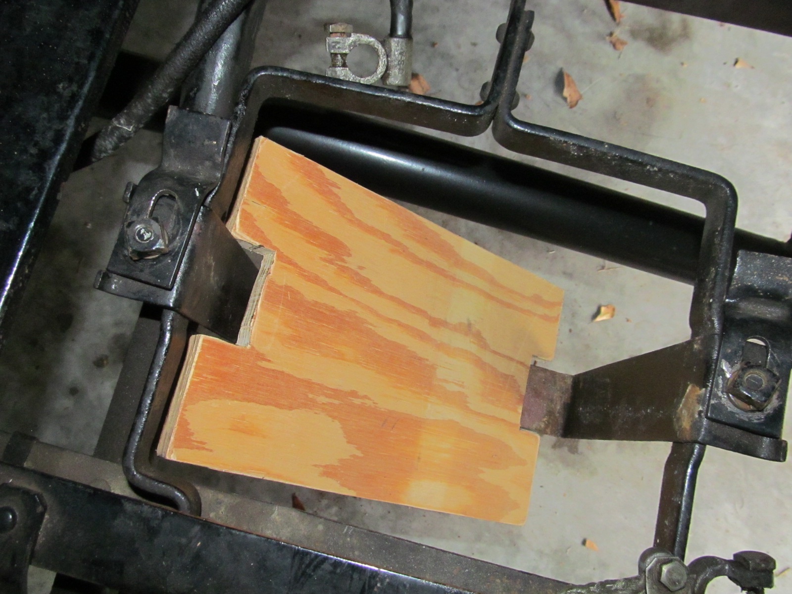 The lower holder is a 3/4" thick board with notches to lock into the straps of the Ford battery carrier. Then wood side braces are screwed and wood glued to the base board..... being added to prevent the oblong battery from moving, the upper wood bar then is used to lock the battery in place. The Ford battery box clamps are used to secure the wood bar.