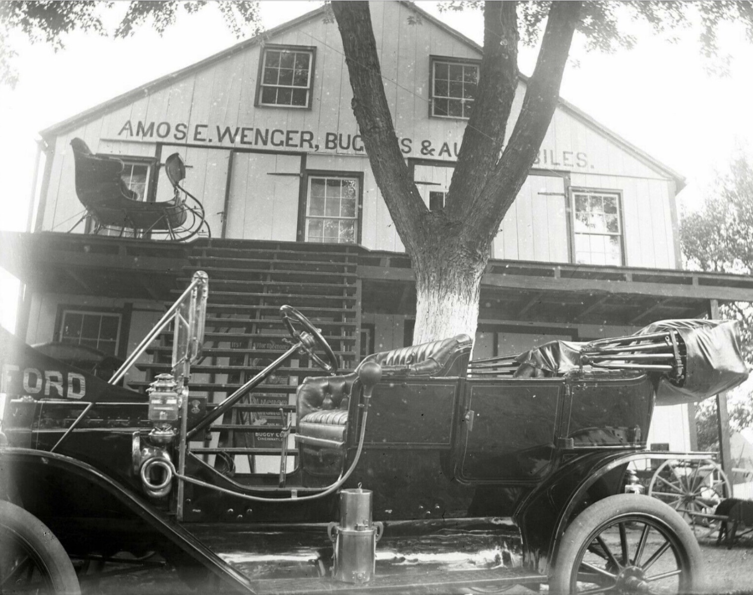 Sign of a progressive business..."Amos Wenger Buggies AND Automobiles"! Smart man. Im sure there were a few who actually resisted the progress. Great pic.