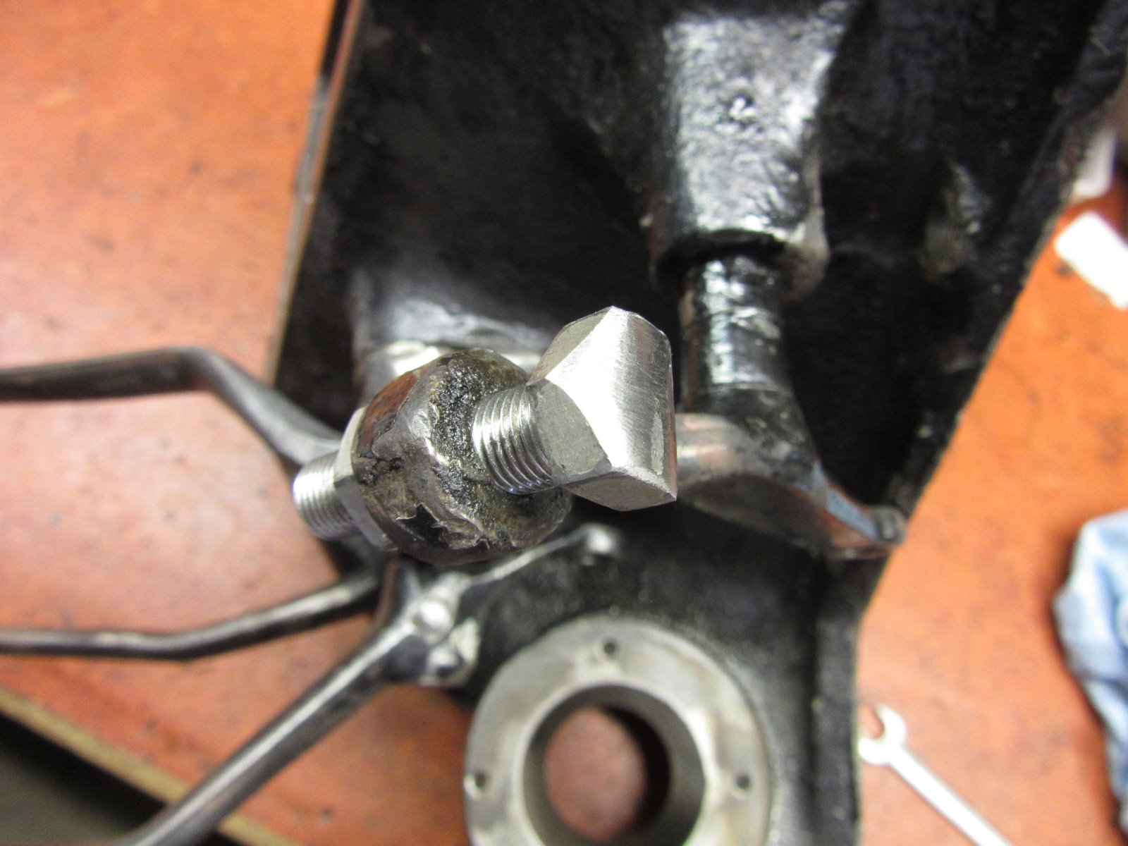 What the Ford way looks like over time, mashed threaded end of bolt on left. New bolt in center with rounded hex. Just grind what shape you wish, the globe end in the old time sketch seems excessive to me, and make future adjustment tough to put a wrench on the round end, but would give a ball bearing slide