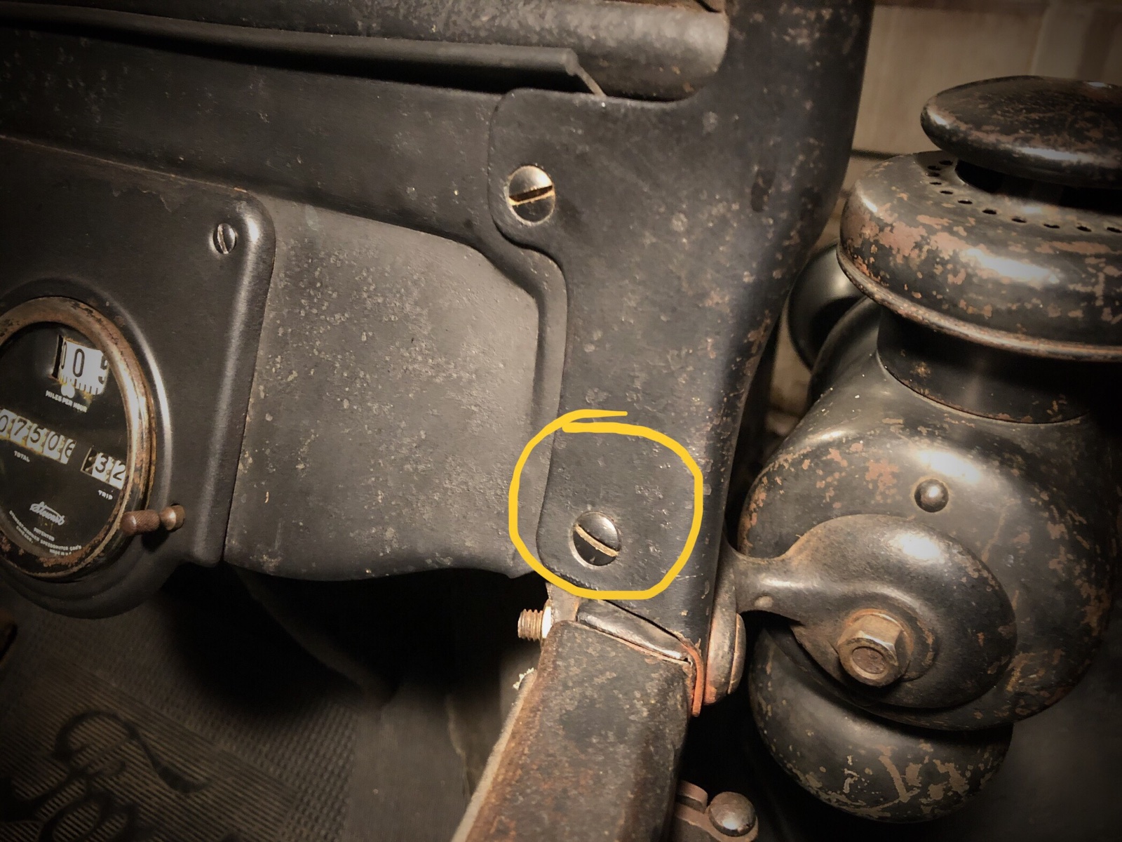 I was driving around in the T last night and felt something small fall on my left foot. It was dark and I didn’t know what it was. This morning I found the peculiar long nut that holds one of the windshield brackets to the body. Turns out a squeak I’ve been chasing was due to this loose screw. So, I found the long nut (shown) but I couldn’t find the 1/4” counter sunk slotted dome head machine screw. (Shown) Anyone have a decent spare?