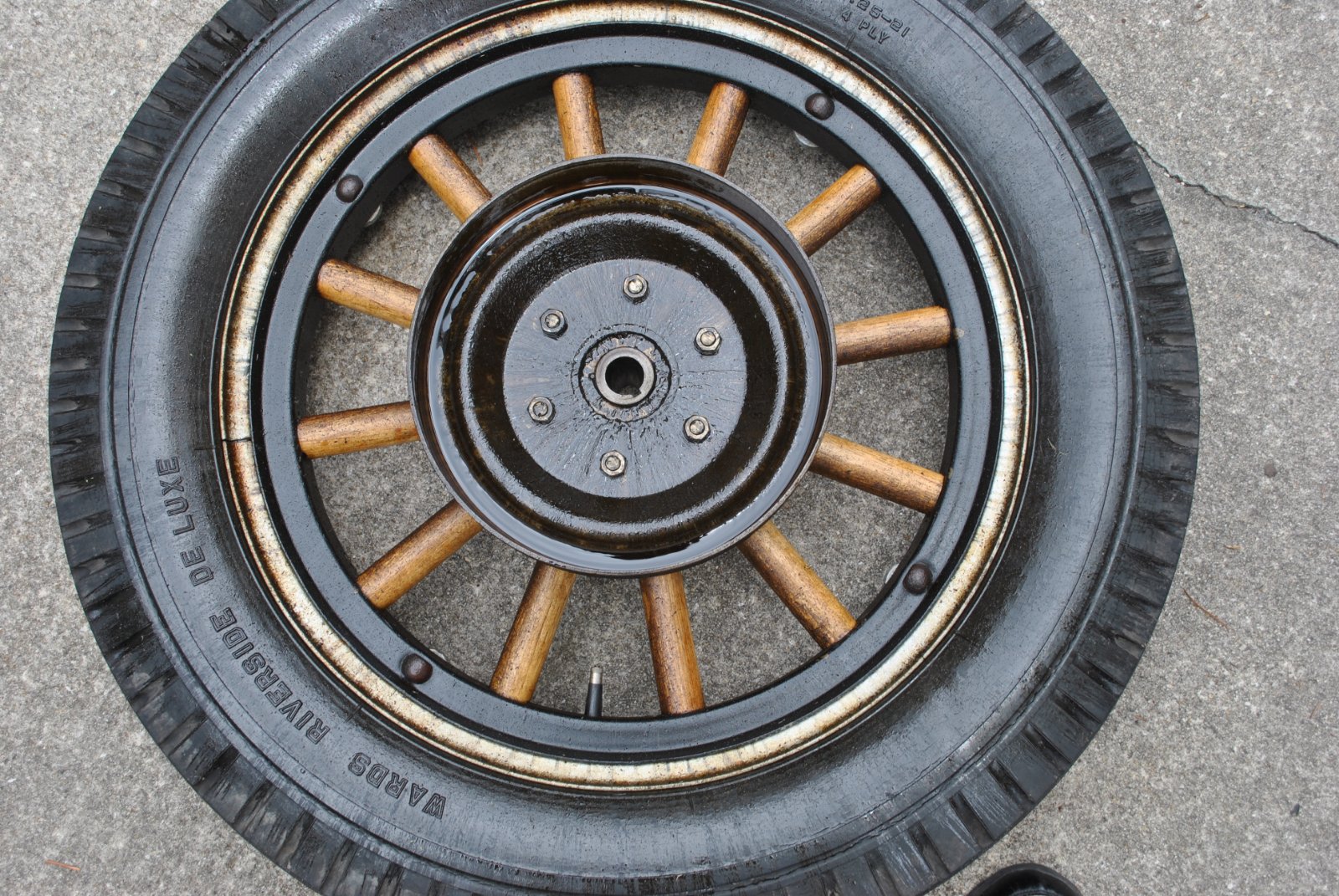 Also bottom pic... 2 spokes are 95 years old, 2 of the new set, stained to match. I wasn't about to give them up just to match my od fellow, hense the search for a Ford rim!