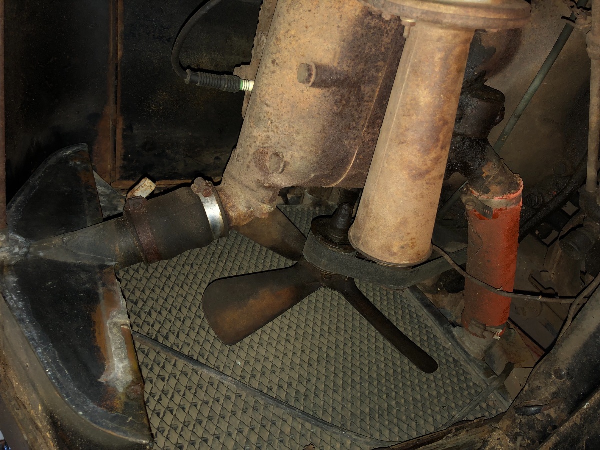 Engine is changed out with a ‘26-27 style motor and transmission. Spoke wheels and 21” tires are later too. Aftermarket radiator, missing top irons.
