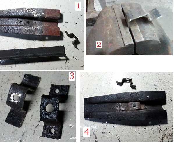 This is the homemade replacement piece. Here is the only original piece and the two I was hammering on today from scrap. The holes were enlarged after this photo. Measurements that I came up with are: 25" long, 1-3/8" face and 5/16" sides. No one makes these.