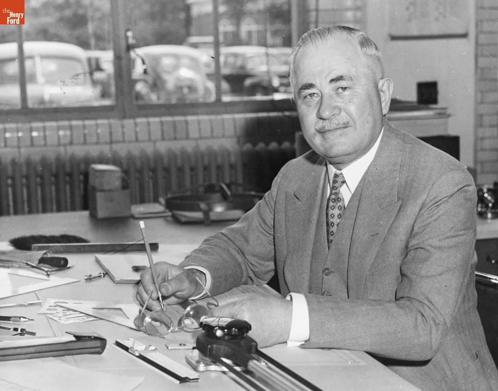 Joe Galamb at FMC drafting table, circa 1943 (courtesy THF, all rights apply).