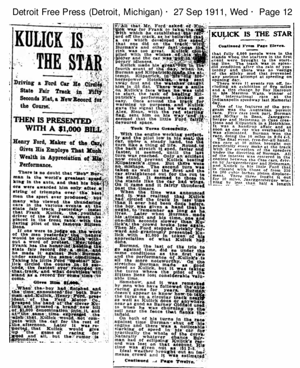This also provided Joe Galamb and Henry Ford the chance to demonstrate to the world the abilities of their smaller racers, the 300 cubic inch and 230 cubic inch Ford Specials, that also won five mile races that afternoon, all driven by Frank Kulick: